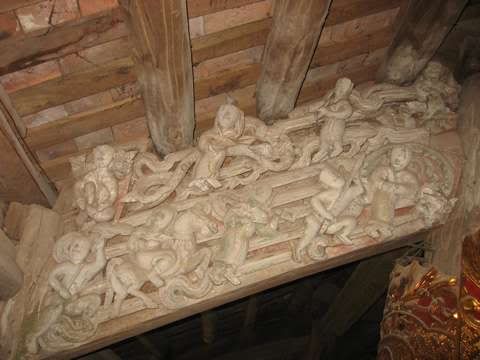Tiêu biểu là hoạt cảnh Vinh quy bái tổ, đó là đám rước quan trạng về làng. Quan trạng cưỡi ngựa, quân lính mang cờ, lọng tháp tùng, cảnh người vác cây đèn đáy, nhạc công của lối hát ca trù chào đón. Cảnh hội làng đông vui với nhiều trò diễn, trò chơi như đấu vật, đá cầu… mừng quan trạng. Cảnh trai gái tình tự, tiên tắm đầm sen, uống rượu chơi cờ… Từ các loài linh vật như: rồng, phượng, ngựa chiến, voi chiến đến các loài vật gần gũi với người: mèo, chim, cá, thạch sùng… đều được chạm khắc sinh động trên các đầu dư, xà, bẩy của nội thất ngôi đình. Những tác phẩm điêu khắc dân gian hoành tráng, trào lộng biến ngôi đình to lớn thành không gian sinh hoạt vui vẻ, gần gũi, đầm ấm với quê hương.