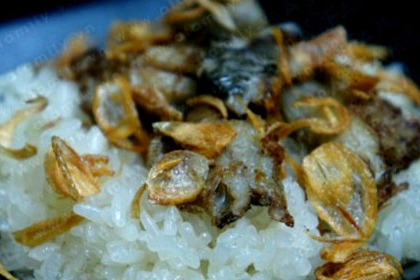 Thịt cá rô sắp lên mặt dĩa xôi rắc hành phi. |