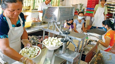 Cô Tuyết, chủ cửa hàng bánh bao Thanh Long 69, thực hiện công đoạn vào nhân cho dây chuyền sản xuất bánh bao trị giá hàng tỉ đồng - Ảnh: Mễ Thuận