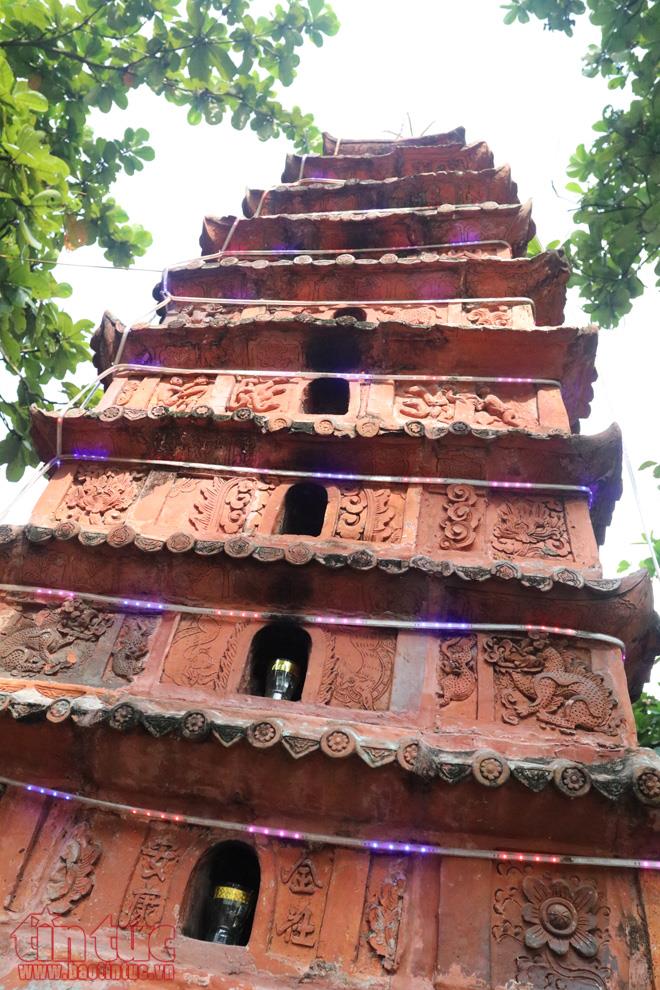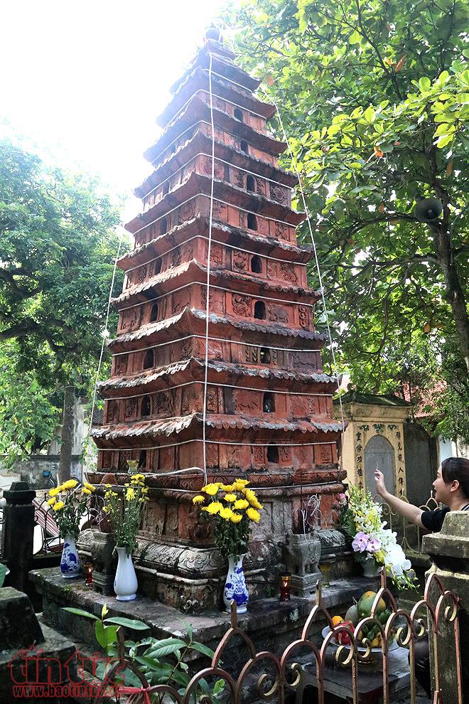Trong đền có một ngọn tháp 9 tầng bằng đất nung. Theo truyền thuyết, đây là nơi thăng giáng của Ngọc Hoàng khi xuống đền Đậu An.