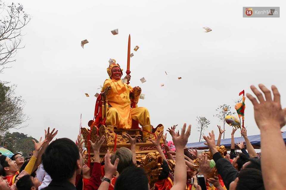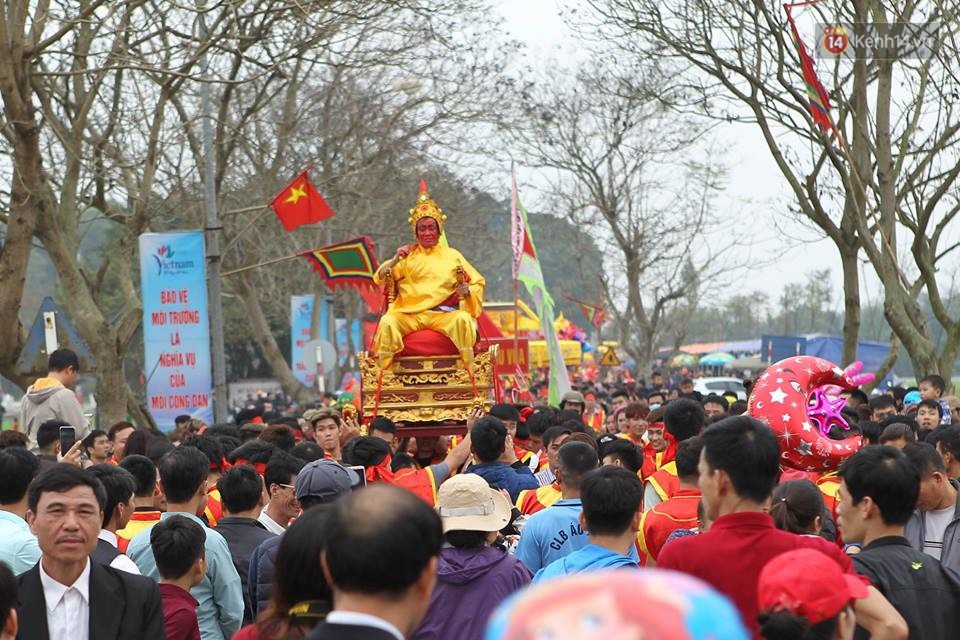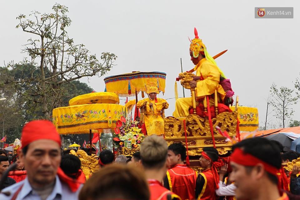 Chiều 26/2, hàng ngàn người dân cùng du khách thập phương tỏ ra hào hứng, phấn khởi tham gia lễ hội rước kiệu vua, kiệu chúa sống ở đền Sái (Đông Anh, Hà Nội).