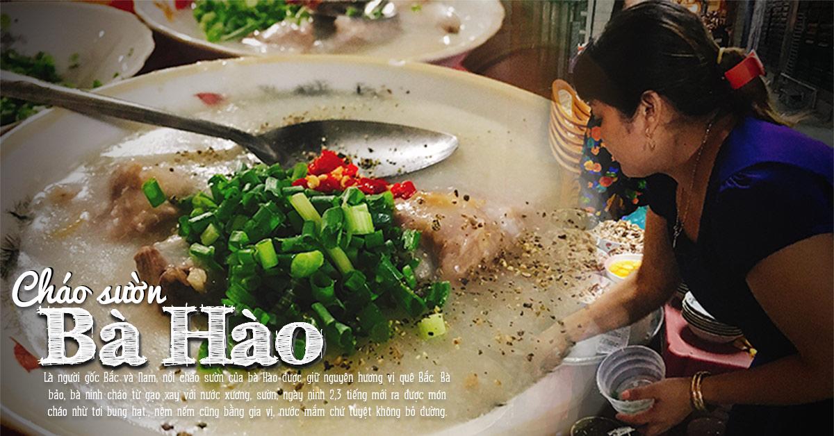 Quán cháo sườn bà Hào (hẻm cuối đường Trần Khắc Chân, quận 1) là một trong những quán cháo lâu đời, nổi tiếng Sài Gòn. Một trong những ấn tượng khiến ai một lần vô tình nhìn thấy gánh cháo này đều tò mò muốn ăn thử, đó là bởi mâm đồ ăn kèm với cháo được quán bày biện vô cùng bắt mắt, cảm tưởng như mọi loại thành phần thực phẩm đều xuất hiện: từ sườn non, xíu mại, quẩy, thịt bằm, trứng gà cho đến gan, lưỡi, mực, da heo, trứng bắc thảo....